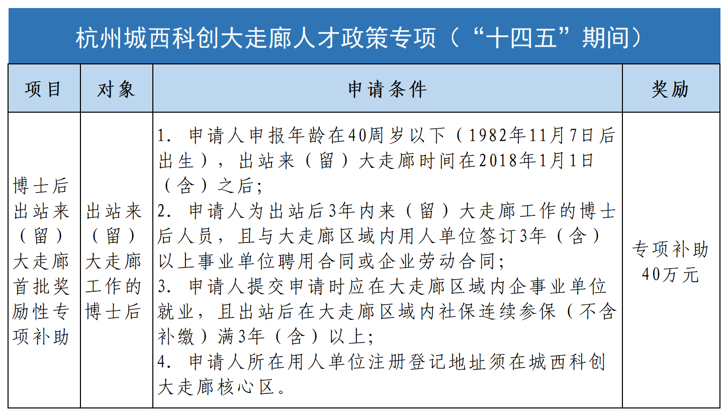 根据浙江省委、省政府关于进一步推进杭州城西科创大走廊打造创新策源地的实施意见和杭州市委、市政府关于加快推进杭州城西科创大走廊高质量融合发展打造创新策源地的实施意见有关要求,“十四五”期间,继续设立杭州城西科创大走廊创新发展专项资金。对于海内外高层次人才来(留)杭州城西科创大走廊的,将给予专项政策支持。具体如下: